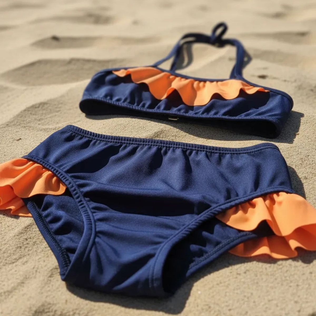O modelo traz um charme especial com babado laranja neon no top e na lateral da calcinha, criando um contraste moderno e alegre com o azul marinho.