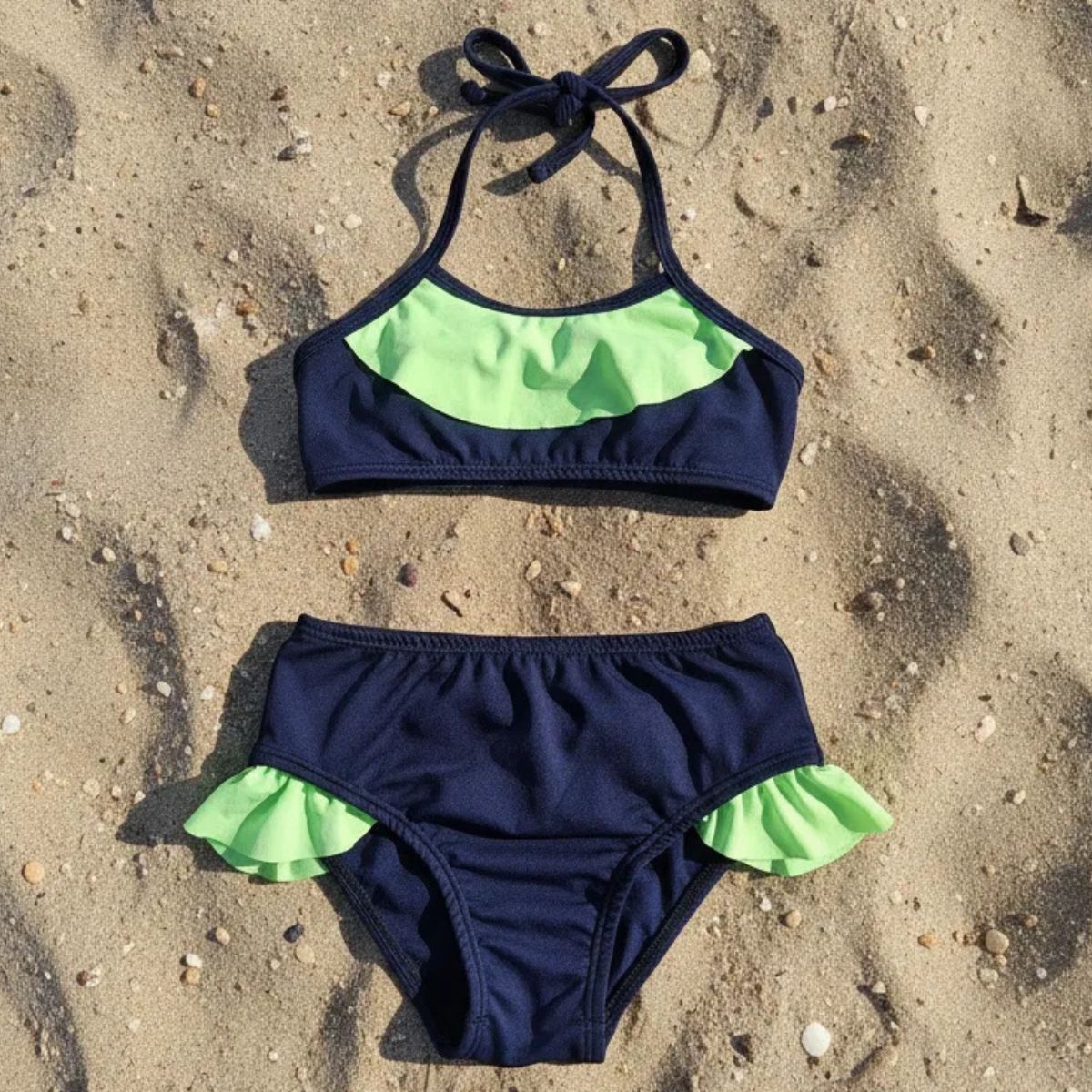 O modelo conta com detalhes de babado verde neon no top e nas laterais da calcinha, trazendo um visual moderno, alegre e cheio de charme. A combinação do azul marinho com verde neon garante destaque e um acabamento lindo.